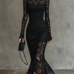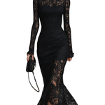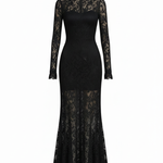 Veronika™ on musta pitsipaita-maxi-mekko, joka ruumiillistaa puhdasta hienostuneisuutta ja magneettisuutta feminiinisyyttä. Luominen, joka muuttaa erityiset hetket unohtumattomiksi muistoiksi, tarjoaa täydellisen siluettin, joka yhdistää käsityöllisen herkkyyttä ja vangitsevaa läsnäoloa.