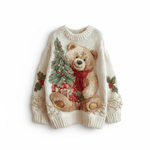 Elena-jouluneule on neulottu pehmeillä nalle-, lahja- ja talvivihreä-yksityiskohdilla, jotka ovat hieman koholla lämpimän vaikutelman luomiseksi. Ribbineulotut reunat kauluksessa, hihansuissa ja helmassa takaavat mukavuuden ja pitävät muodon.